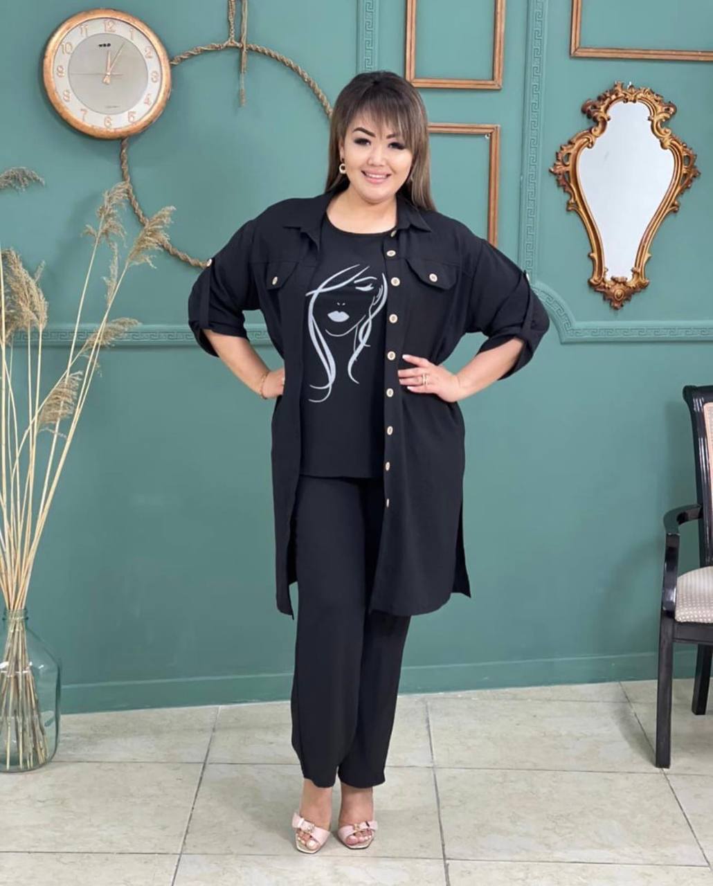 Костюм-тройка с оригинальным накатом, все три детали гардероба можно носить отдельно: блуза с качественным накатом, как на фото, с обеих сторон разреза; брюки на широкой резинке, по бокам кармана; удлиненная рубашка, застегивающаяся на пуговицы, рукав на патик с пуговицей (длину можно регулировать), на груди нерабочие карманы с пуговицей, с обеих сторон рубашки рабочие карманы.