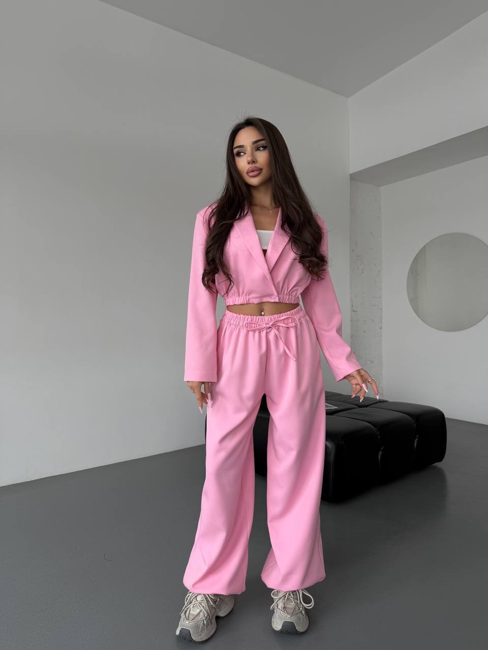 Костюм (укороченный жакет с V-образным вырезом+брюки палаццо с высокой посадкой) розовый