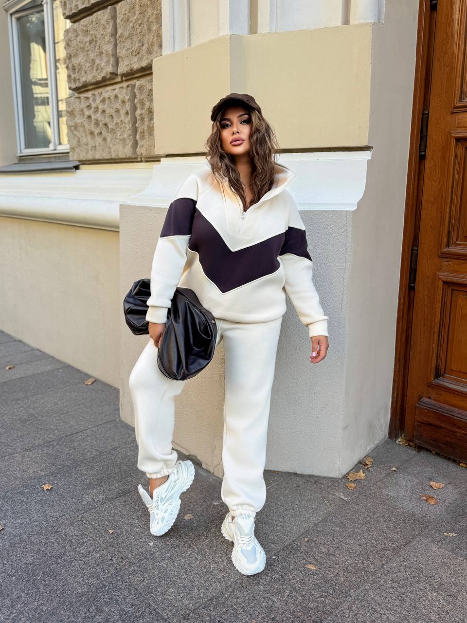 Костюм: худи с контрастными вставками+штаны на резинке сливочный