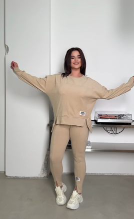 Головна » Магазин » ОДЕЖДА » ЖЕНСКИЕ СПОРТИВНЫЕ КОСТЮМЫ » Костюм (худи с манжетой по низу и разрезами+леггинсы с разрезами) бежевый