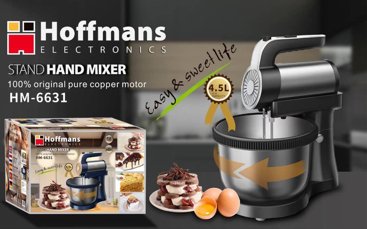 Кухонный миксер Hoffmans HM-6631 с вращающейся металлической чашей 4,5 л и подставкой — многофункциональный кухонный девайс, который позволит вам взбить яйца, сливки и нежный крем, а также замесить тесто быстро и без труда.