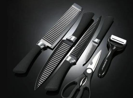Кухонные ножи — 6 предметов сделаны из нержавеющей стали. Особое скольжение во время резки достигается благодаря универсальной форме клинков, а также специальному покрытию Granitex. Из-за чего к ножам не пристает пища, а лезвия долго остаются острыми. Это покрытие значительно продлевает срок службы изделия, а также повышает резки.