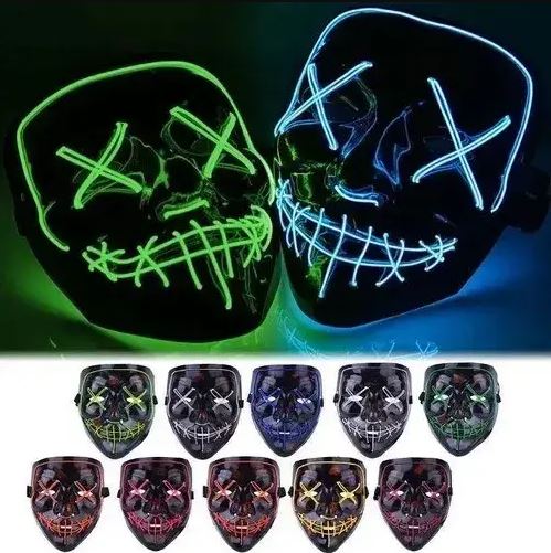 Неоновая маска является одним из самых желанных аксессуаров для вечеринок. Выполнена из безопасного пластика имеет вырезы для глаз, носа и рта, что позволяет долго находиться в ней без каких-либо трудностей. Компактный блок питания можно положить в карман или зафиксировать на ремне благодаря предусмотренному фиксатору. Свет маски не мешает смотреть в темноте, глаза нормально воспринимают свечение. Питание происходит от двух батареек размера АА. Маска крепится на голову удобной регулируемой по размеру резинкой.
