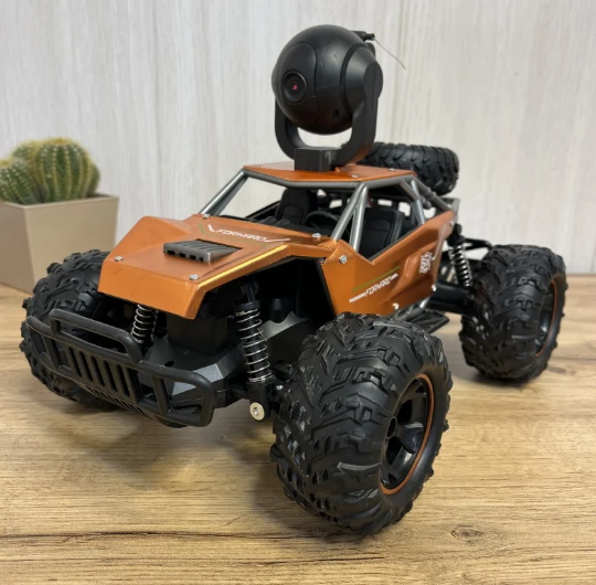 CAM багги с камерой — это мини-внедорожник с FPV-камерой 0,3 МП, которая передаёт видео на смартфон по Wi-Fi в реальном времени.