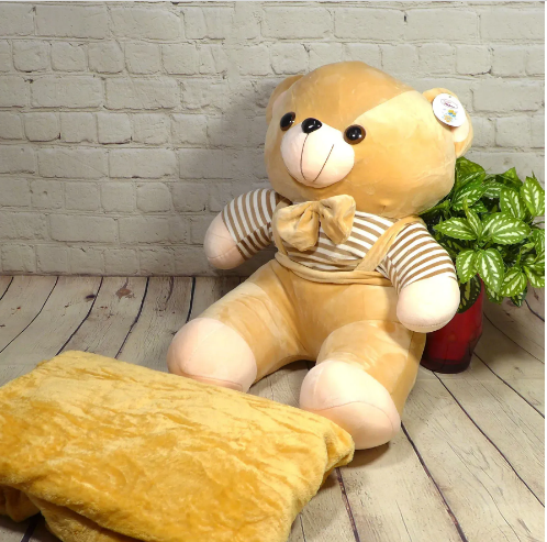 Характеристики: Размер пледа: 100х176 см Размер игрушки — 50 см Материал: плюш Цвет — коричневый, бежевый