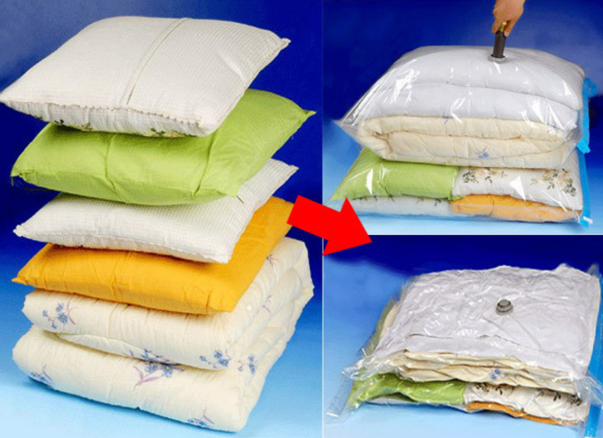 Вакуумные пакеты предназначены для хранения вещей, помогут Вам сэкономить пространство в Вашем шкафу. Подушки, куртки, одеяла, свитера и многое другое теперь не будут занимать все пространство Вашего шкафа. Идеально для переезда на отдых или на дачу, а так же при смене квартиры. Вакуумные пакеты очень просты в использовании: достаточно выпустить воздух из пакета вручную, просто скатав его, или с помощью пылесоса и специального клапана на пакете откачать воздух, пухлый пакет моментально уменьшиться в несколько раз.