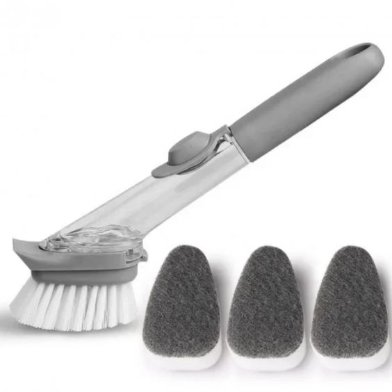 Многофункциональная щетка для мытья посуды с дозатором и насадками сократит время пребывания возле раковины и сэкономит место на кухне.