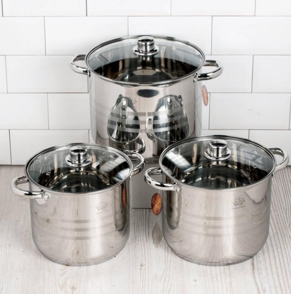 Набор посуды из 3 кастрюль с многослойным толстым индукционным дном имеет 6 предметов.