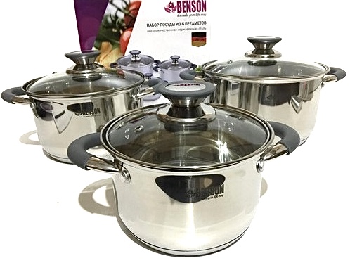 Внутри кастрюль мерная шкала. Набор посуды подходит для всех типов плит, включая индукционные.