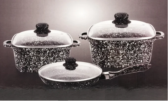 Набор изготовлен из кованого алюминия, имеет толстые стенки и дно, что обеспечивает равномерное распределение и сохранение тепла. Благодаря покрытию, посуда имеет высокую прочность и износостойкость. Главная особенность такой посуды — возможность приготовления вкусной и полезной пищи без добавления масла. Мраморное покрытие безопасно для здоровья человека и позволит сохранить в продуктах максимум витаминов. К кастрюлям идут крышки из жаропрочного стекла с отверстием для выхода пара. Ручки изготовлены из бакелита. Посуда пригодна для использования на плитах любого типа, в том числе и индукционных.