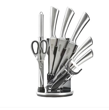Набор ножей Benson BN-415 состоит из 9 предметов – 5 ножей разного назначения, кухонных ножниц, подставки, овощечистка, точилки «мусат».