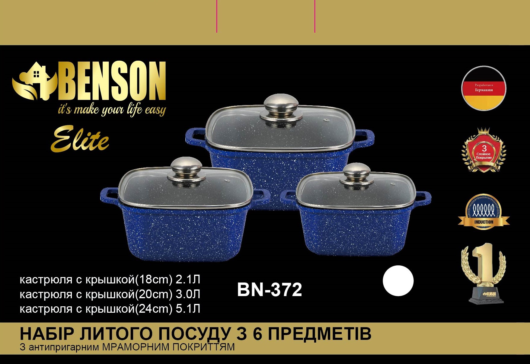 Набор посуды Benson состоит из трех кастрюль с крышками. Изделия выполнены из литого алюминия с мраморным антипригарным покрытием, устойчивым к царапинам. Кроме того, такое покрытие позволяет готовить здоровую пищу с минимальным добавлением жира или масла, легко моется. Крышки изготовлены из термостойкого стекла и оснащены отверстием для выхода пара. Такая крышка позволяет следить за процессом приготовления пищи без потери тепла. Она плотно прилегает к краю кастрюли, сохраняя аромат блюд.