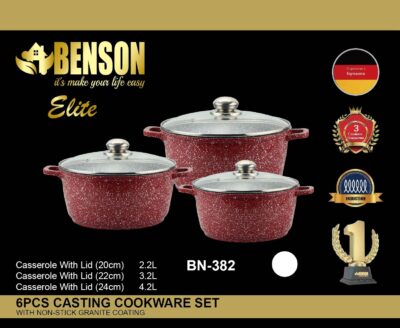 Набор посуды Benson состоит из трёх кастрюль с крышками. Изделия выполнены из литого алюминия с гранитным антипригарным покрытием, устойчивым к царапинам. Кроме того, такое покрытие позволяет готовить здоровую пищу с минимальным добавлением жира или масла, легко моется. Крышки изготовлены из термостойкого стекла и оснащены отверстием для выхода пара. Такая крышка позволяет следить за процессом приготовления пищи без потери тепла. Она плотно прилегает к краю кастрюли, сохраняя аромат блюд.