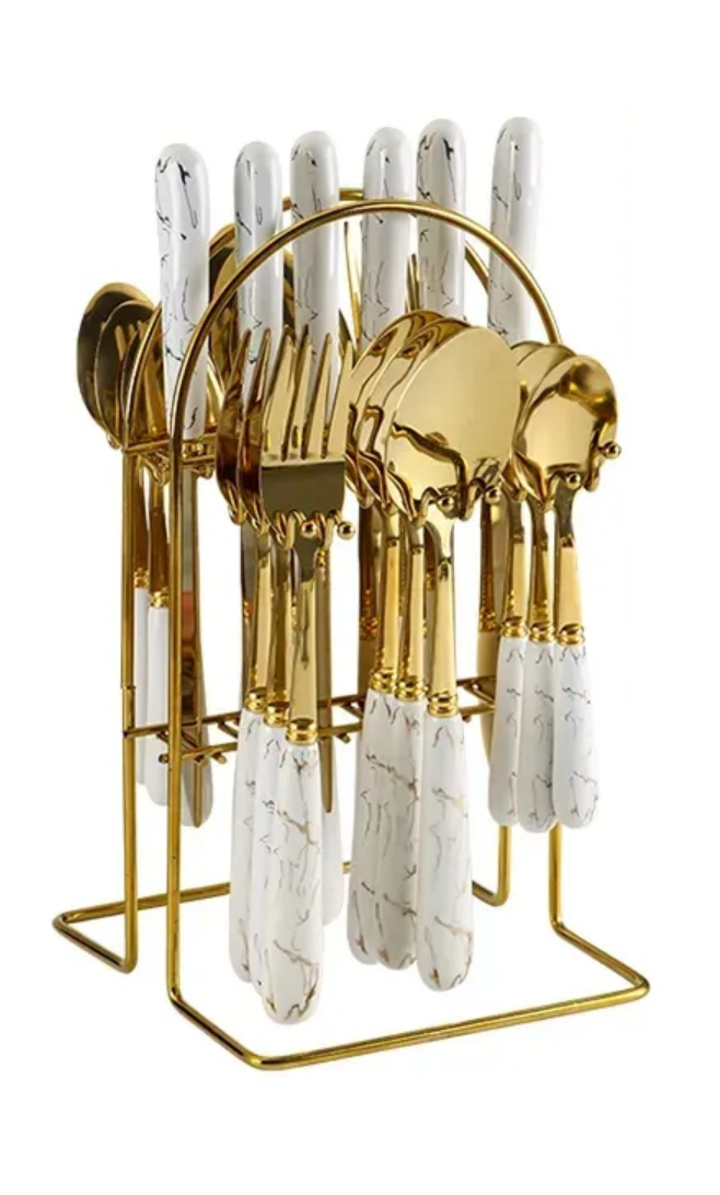 Набор состоит из 24 предметов: нож, вилка, столовая ложка, десертная ложка. Материал основания – нержавеющая сталь с зеркальным напылением золотистого цвета.