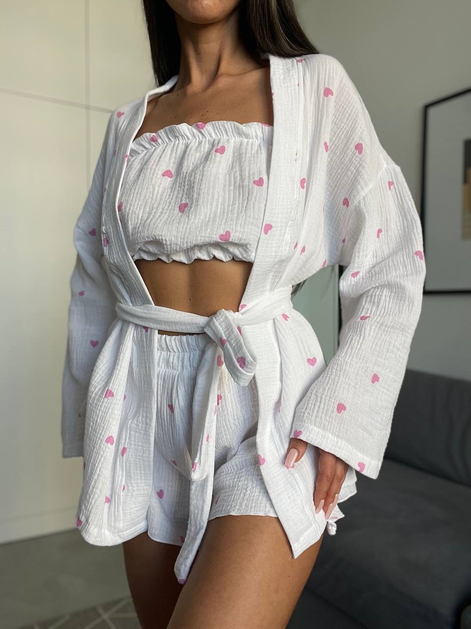 Муслин 100% хлопок ❣️В комплект входит: шортики, топ, накидка с поясом Цвета: точно как на фото Размеры:42-46