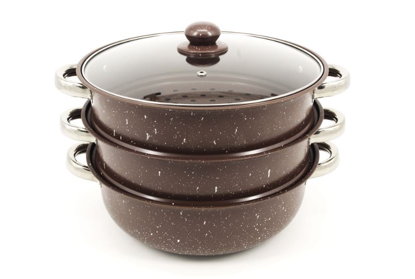 Пароварка из нержавеющей стали в виде 3х ярусной кастрюли с крышкой. В такой пароварке можно готовить как каши так и овощи с мясом, приготовления фруктов, овощей, рыбы. Основное преимущество данного изделия в том, что не требуется добавления жиров. Она подходит для детей, используется для различных диет. Данную модель можно использовать как небольшую мантышницу, пароварку в которой можно готовить сразу три разных блюда и просто кастрюля.