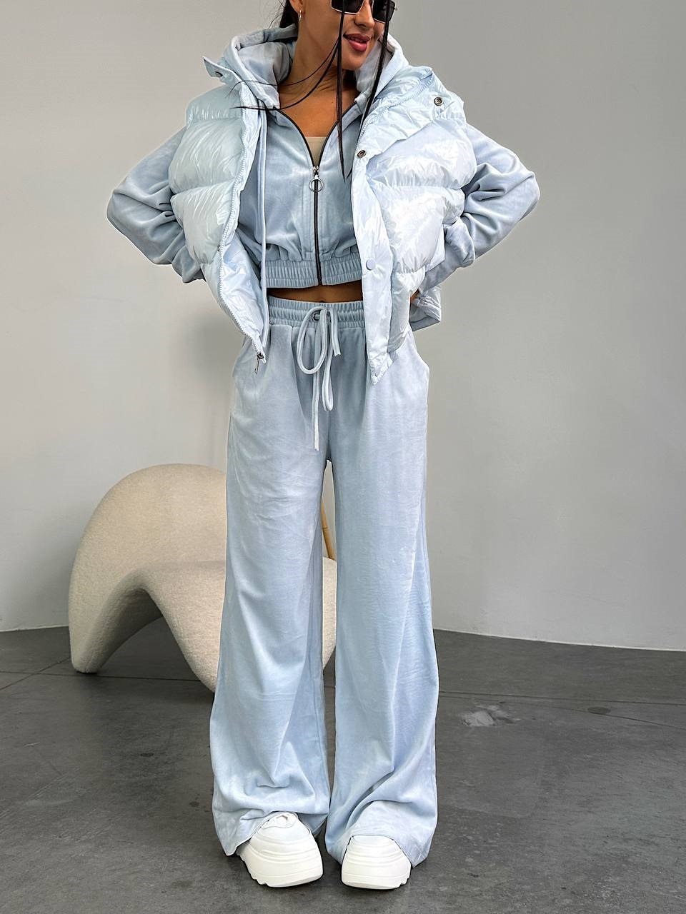 Плюшевый Костюм тройка (брюки свободные+кофта с капюшоном+топ) голубой