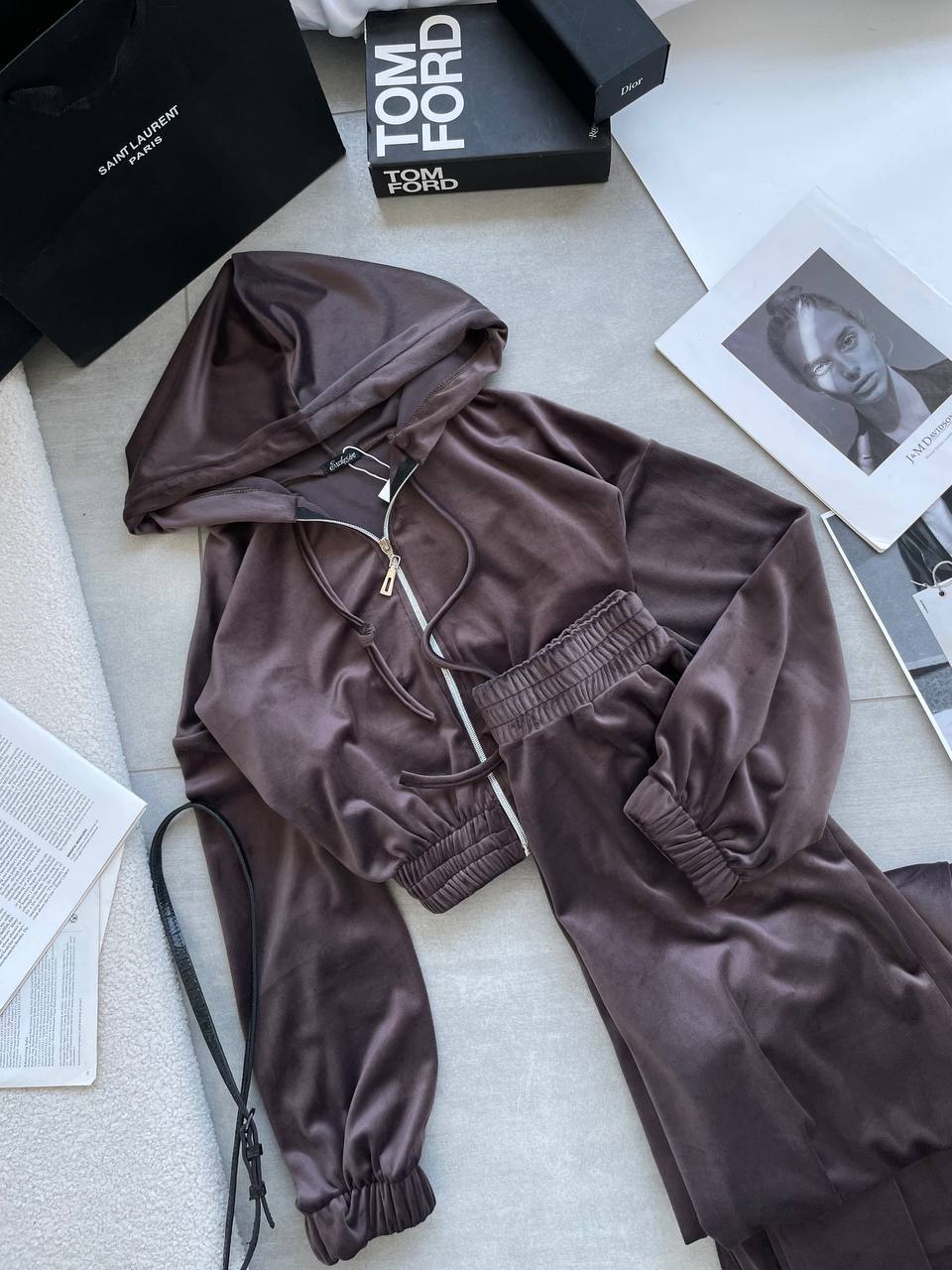 Повседневный костюм из приятного и мягкого к телу велюра. Модель с приспущенными плечами оверсайзом, по талии резинка. Брюки палаццо на резинке с широким кроем и высокой посадкой.