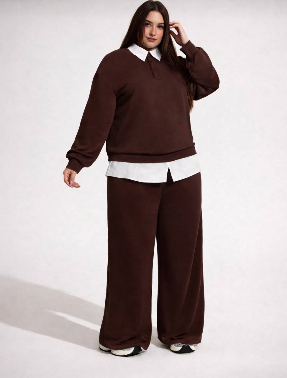 Кофта оригинального кроя выполнена из трикотажа с добавлением белого супер софта на воротнике и снизу с имитацией рубашки. .Брюки-палаццо средней посадки на резинке с карманами.