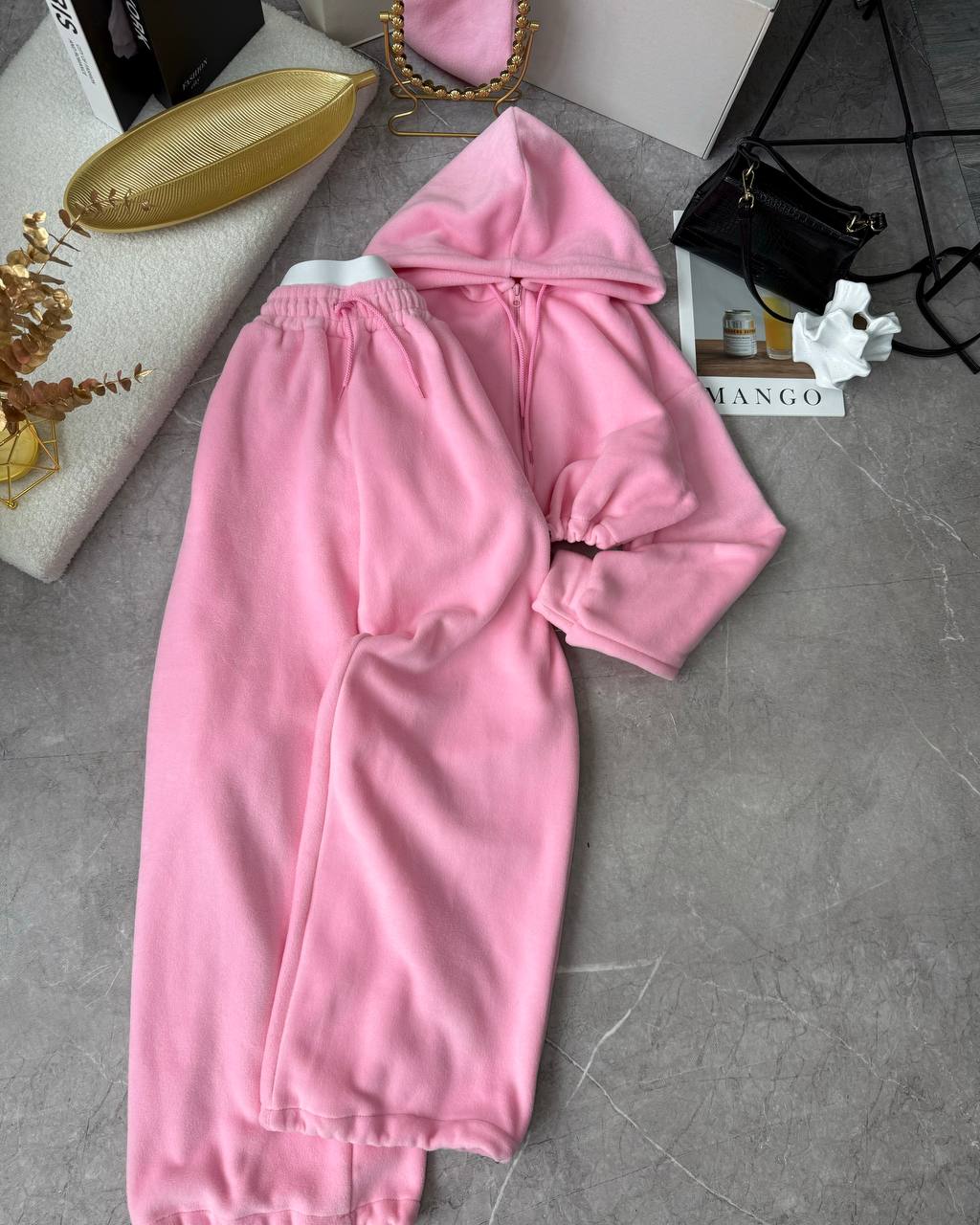 Будьте первым, кто оставил отзыв на “Прогулочный костюм-тройка: укороченная кофта+топ+объемные брюки розовый”
