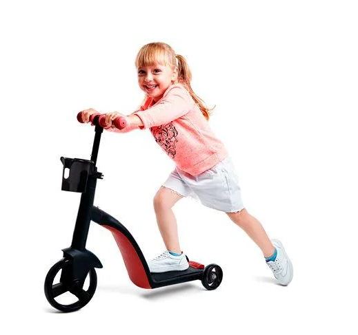 Новый универсальный вид транспорта для детей, который соединяет в себе самокат, беговел и велосипед. В подножке есть место для хранения педалей, поэтому если ребенок решил сменить свой вид транспорта, их легко можно установить и трансформировать самокат в велосипед.