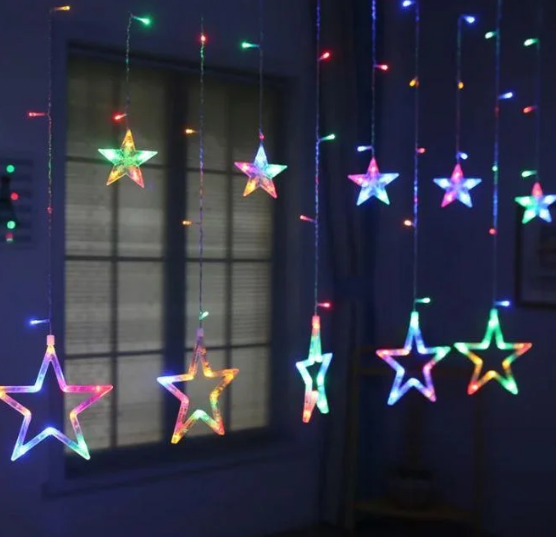 Светодиодная гирлянда-штора состоит из 2.5-метрового шлейфа-основания с вертикально свисающими 12 нитями разной длины: 6 больших звезд и 6 звезд поменьше.