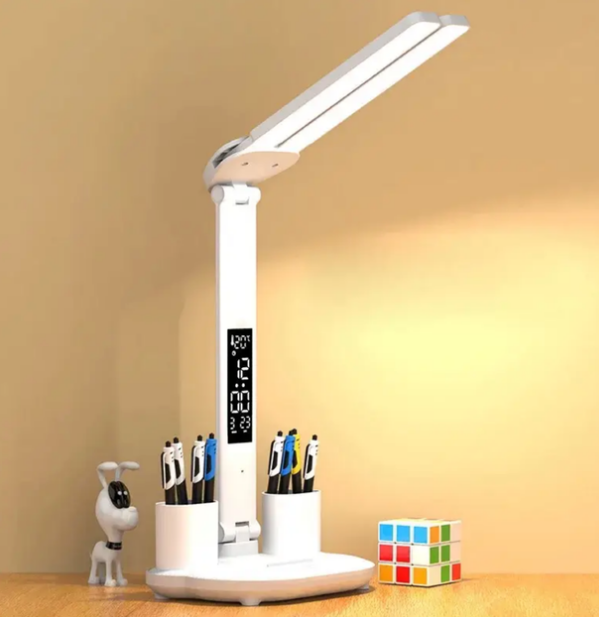 Светодиодная настольная лампа с термометром, часами, календарем, держателями для ручек Белая