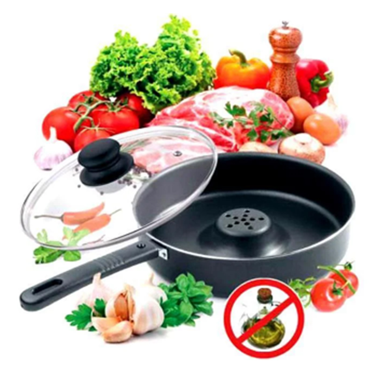 Сковорода Драй Кукер диаметром 26 см поможет Вам готовить любую пищу без применения масла и других жиров. Это одновременно и сковорода и пароварка, которая готовит с помощью горячего воздуха, полностью изменит привычный стиль приготовления еды. Стальная сковорода с антипригарным покрытием, достаточно легкая и надежная подходит как для газовых так и электрических плит и плиток. Внутри сковороды Dry Cooker имеется особая возвышенность с отверстиями, которая создает поток горячего воздуха для равномерного его распределения по всей внутренней части сковороды, сверху-вниз и по-кругу. Все что нужно, это смазать поверхность сковороды тонким слоем масла или маргарина. Это позволит Вам жарить без жира до образования хрустящей корочки. Сковороду Dry Cooker можно мыть как вручную так и в посудомоечной машине. Съемная ручка позволит сэкономить пространство на кухне. Большая и удобная крышка надежно закрывает сковороду, что создает внутри оптимальную концентрацию пара и равномерную циркуляцию горячего воздуха.