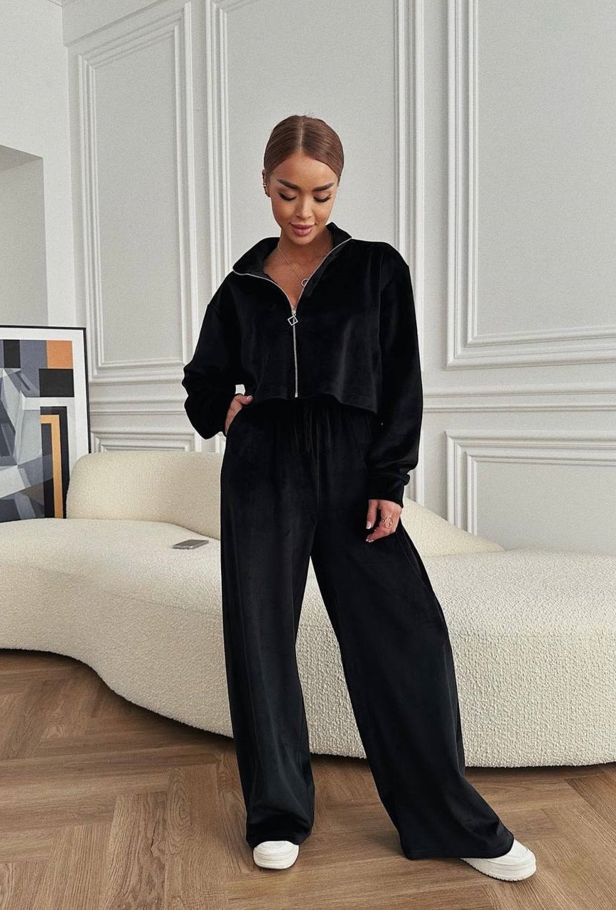 Костюм изготовлен из мягкой и приятной на ощупь ткани велюр плюш. Фасон костюма спортивный. Удобен и удобен для прогулок. С таким костюмчиком твое настроение будет всегда суперовое.