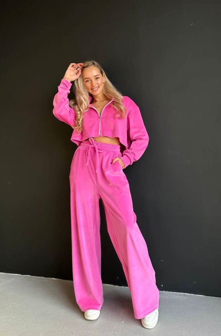 Костюм изготовлен из мягкой и приятной на ощупь ткани велюр плюш. Фасон костюма спортивный. Удобен и удобен для прогулок. С таким костюмчиком твое настроение будет всегда суперовое.
