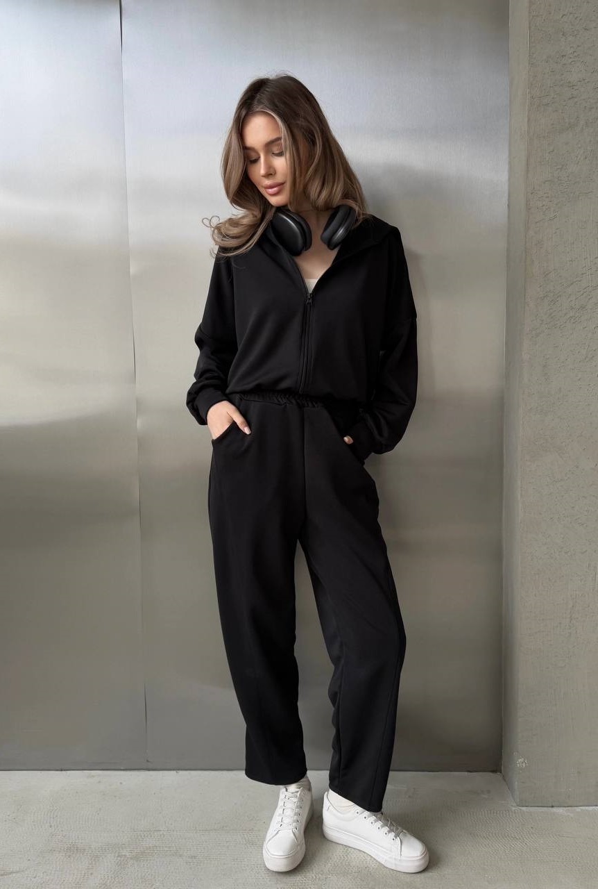 Головна » Магазин » ОДЕЖДА » ЖЕНСКИЕ СПОРТИВНЫЕ КОСТЮМЫ » Спортивный костюм (кофта на молнии с капюшоном+брюки с акцентними швами) черный