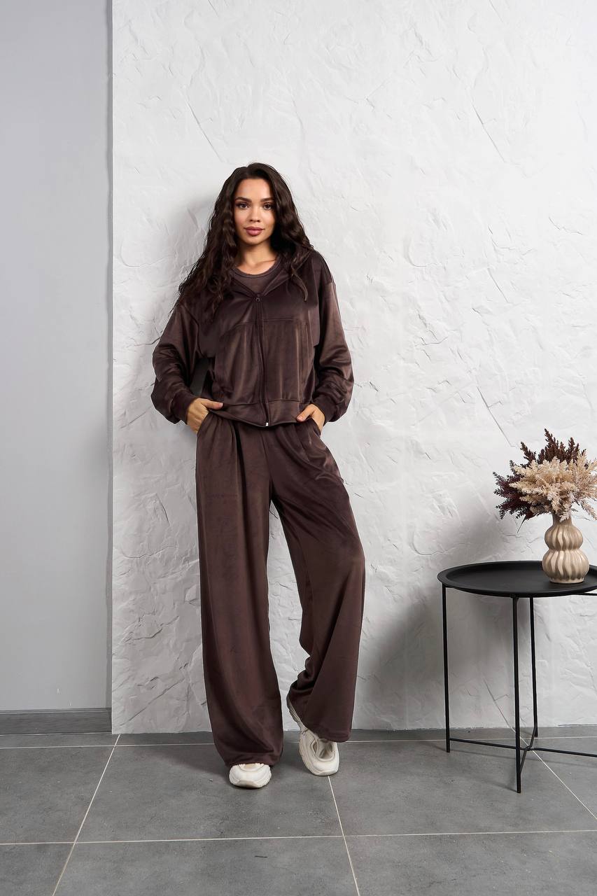 Спортивный костюм: кофта с двойным капюшоном и широкие брюки шоколад