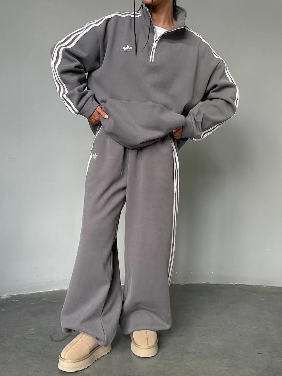 Головна » Магазин » ОДЕЖДА » ЖЕНСКИЕ СПОРТИВНЫЕ КОСТЮМЫ » Спортивный костюм свободного кроя с лампасами серый