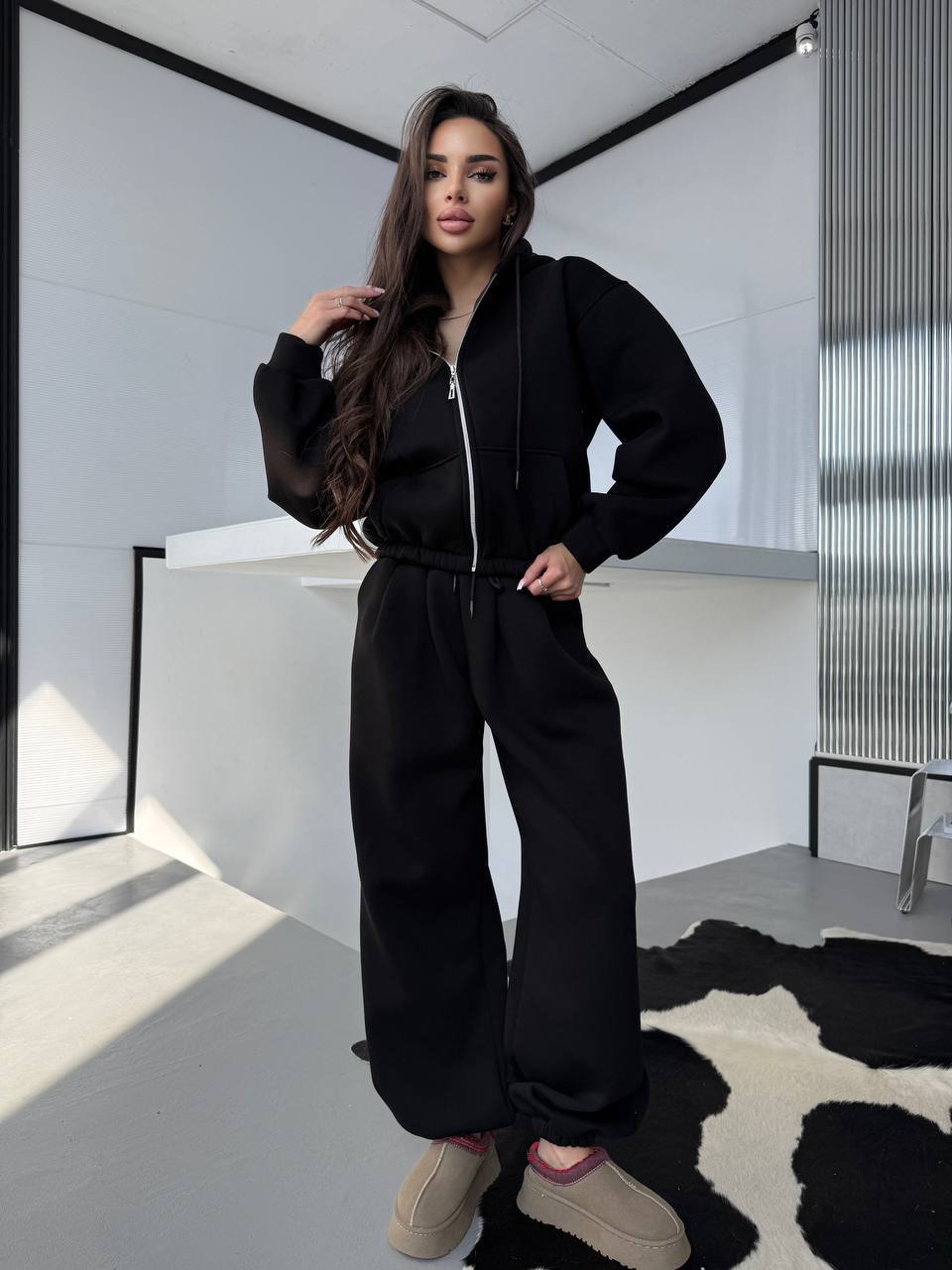 Спортивный костюм трехнитка (кофта с капюшоном на молнии+брюки свободные) черный