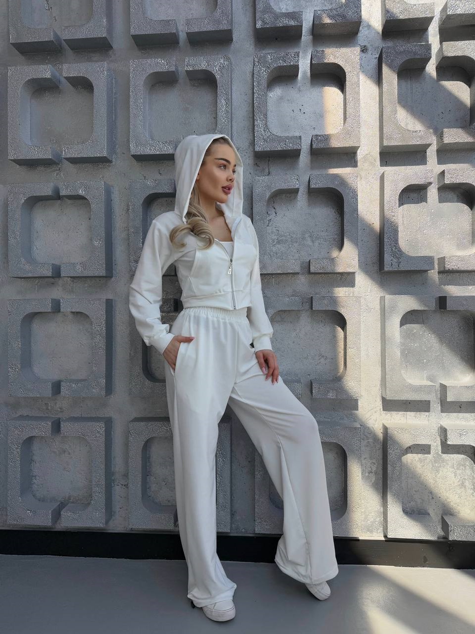 Головна » Магазин » ОДЕЖДА » ЖЕНСКИЕ СПОРТИВНЫЕ КОСТЮМЫ » Спортивный костюм (укороченная кофта на молнии+свободные брюки низ на резинке) молочный