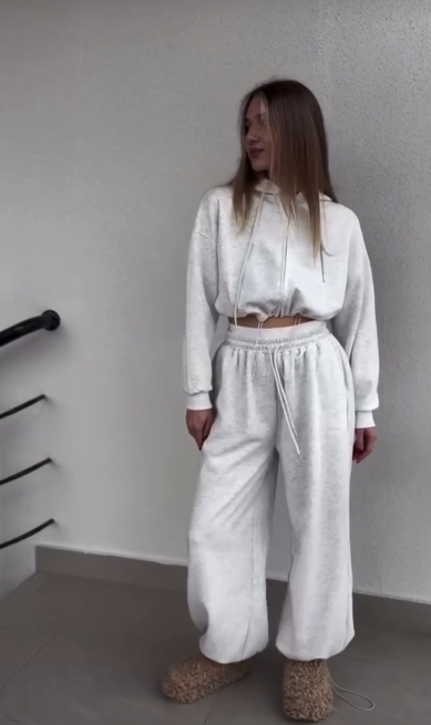 Спортивный прогулочный костюм – тройка в стиле оверсайз, из укороченной кофты, топа и объемными брюками. Приятная мягкая ткань, не лохматится. Топ тянется и садится по фигуре. Кофта и брюки имеют снизу фиксаторы для удобства. Брюки идут с резинкой, как на фото, и шнурками.