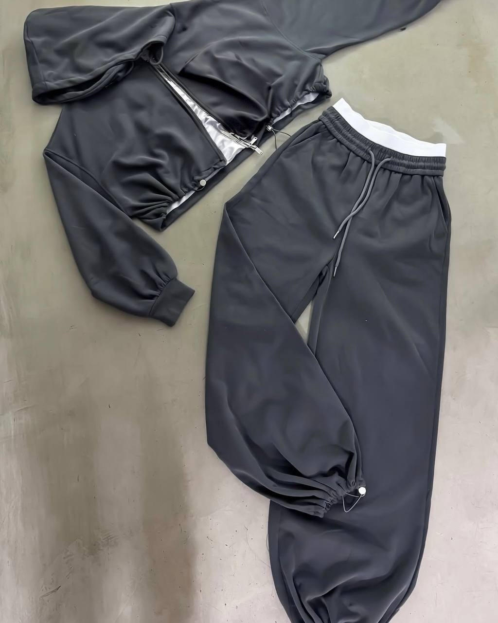 Будьте первым, кто оставил отзыв на “Спортивный прогулочный костюм 3-ка: укороченная кофта+топ+объемные брюки графит”