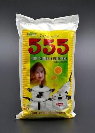 Чистящее средство 555 с лимоном 1кг 555 – универсальное чистящее средство. Многие хозяйки уже убедились, что этот чистящий порошок способен справиться с любым загрязнением ванной комнаты и сантехники, посуды, пола и многих других поверхностей. Так же 555 оставляет после себя приятный аромат лимона и хорошо смывается со всех поверхностей, не оставляя белых следов или разводов.
