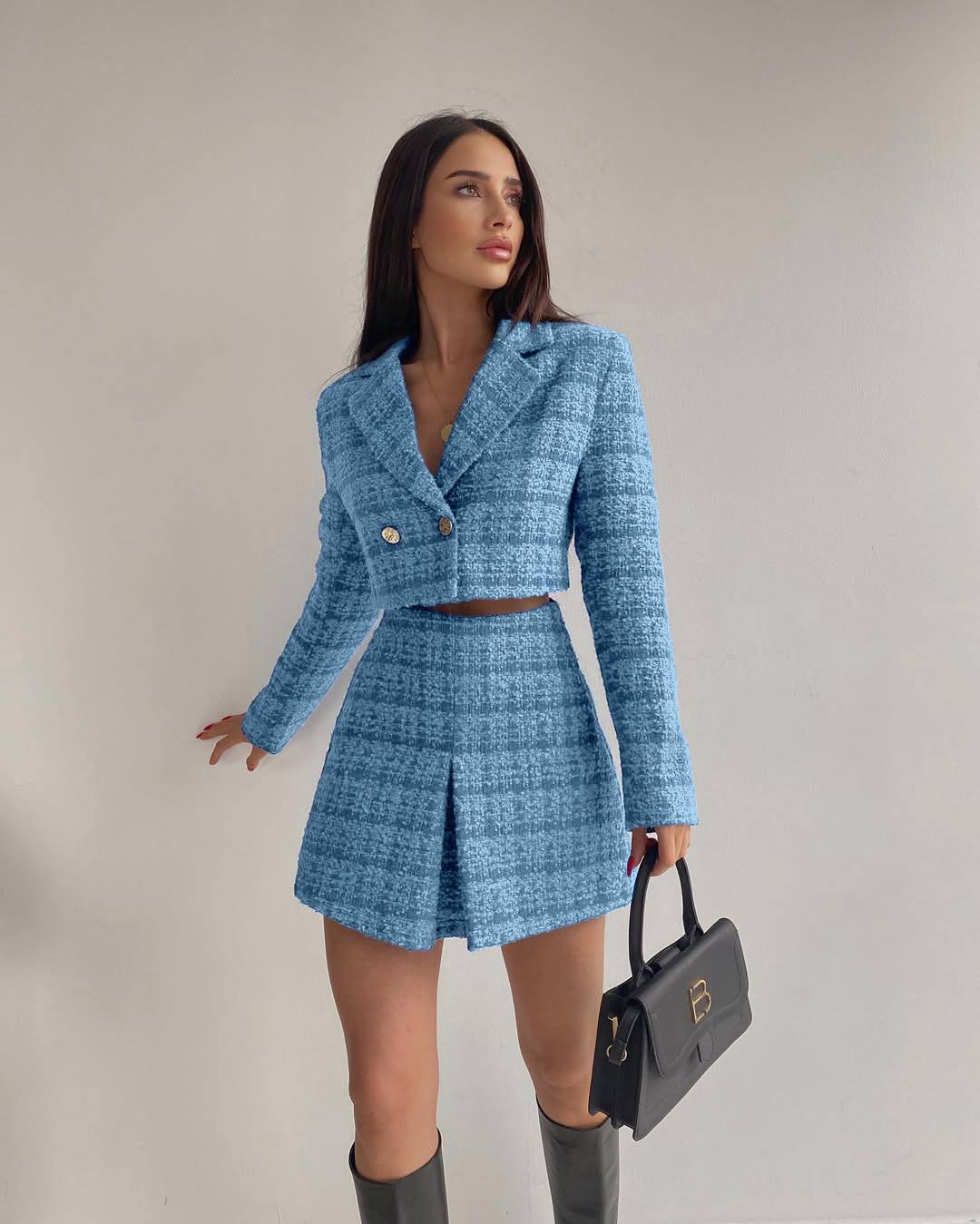 Твидовый костюм (укороченный жакет+юбка-шорты) голубой