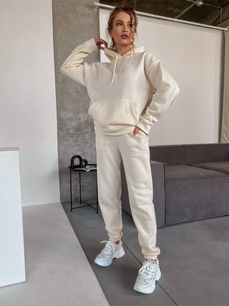 Теплый базовый костюм: кофта с завязками и карманом кенгуру+штаны с карманами молочный