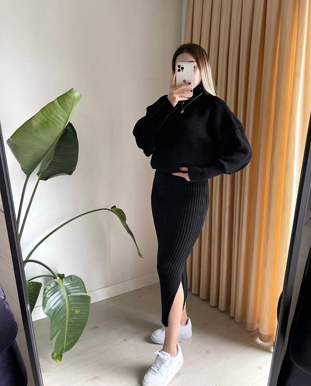 Теплый костюм из свитера и юбки. Выполнен из плотной ткани. На юбке сбоку имеется небольшой разрез. Подчеркивает фигуру и придает женственности