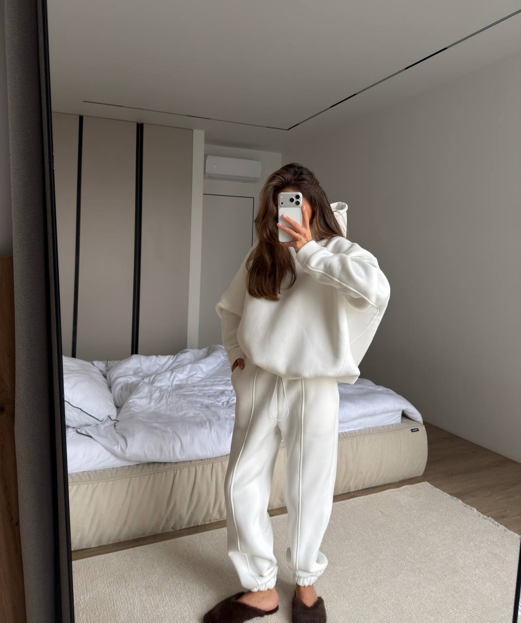 Теплый костюм из трехнитки (кофта с капюшоном+брюки со срелками+низ на резинке) молоко