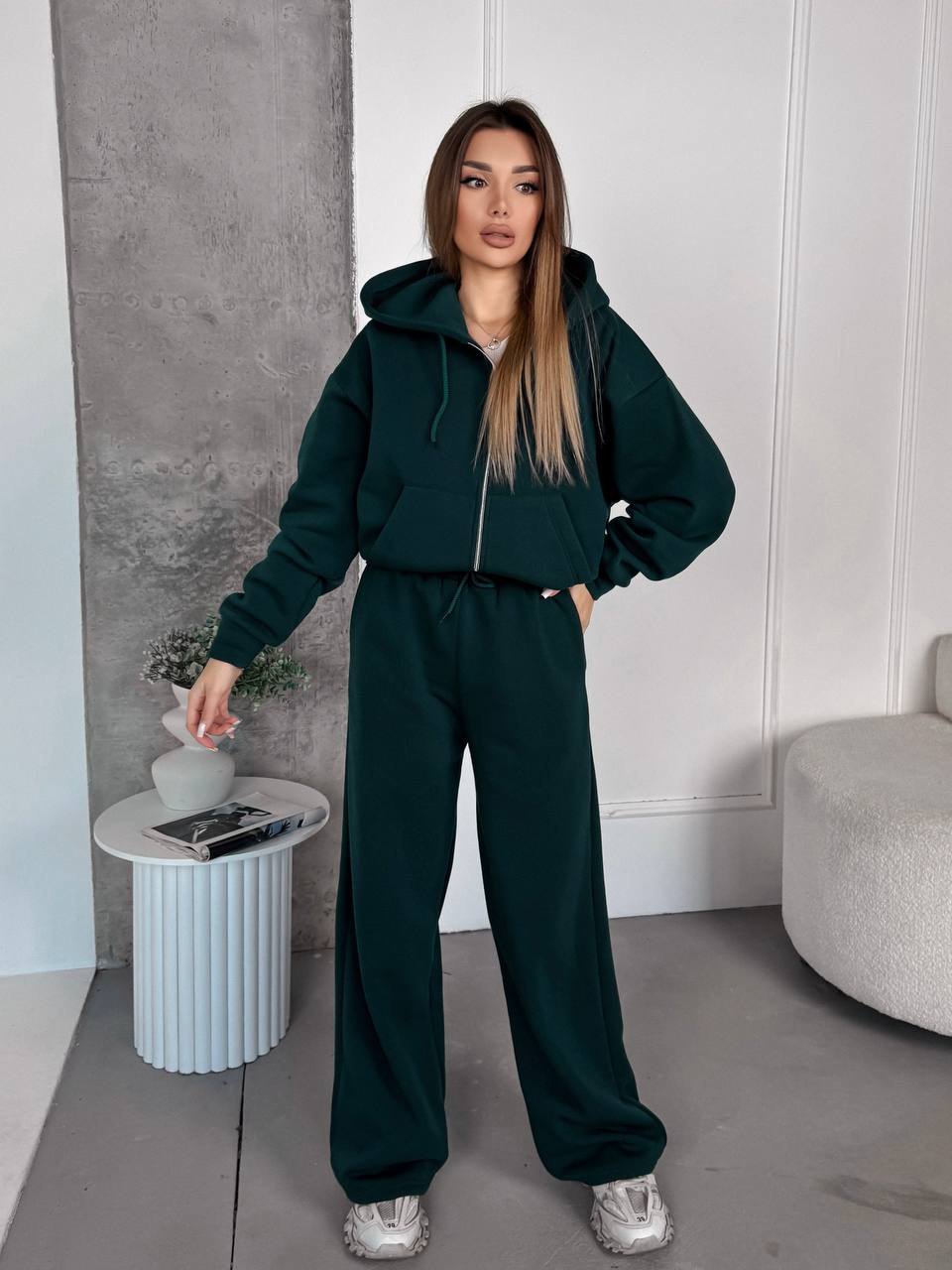 Будьте первым, кто оставил отзыв на “Теплый костюм из тринитки на флисе: кофта на змейке со спущенным рукавом+штаны с карманами изумруд”