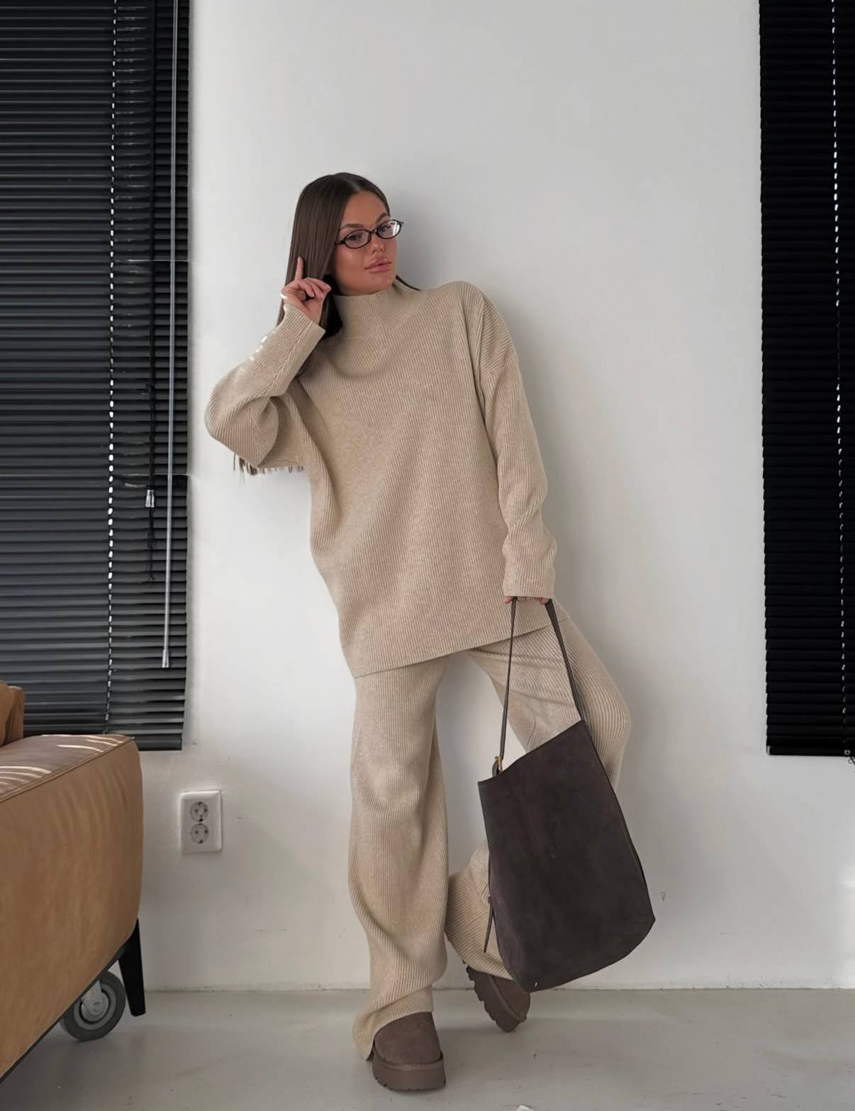 Трикотажный костюм из ангоры (свитер+брюки свободного кроя на высокой посадке) бежевый