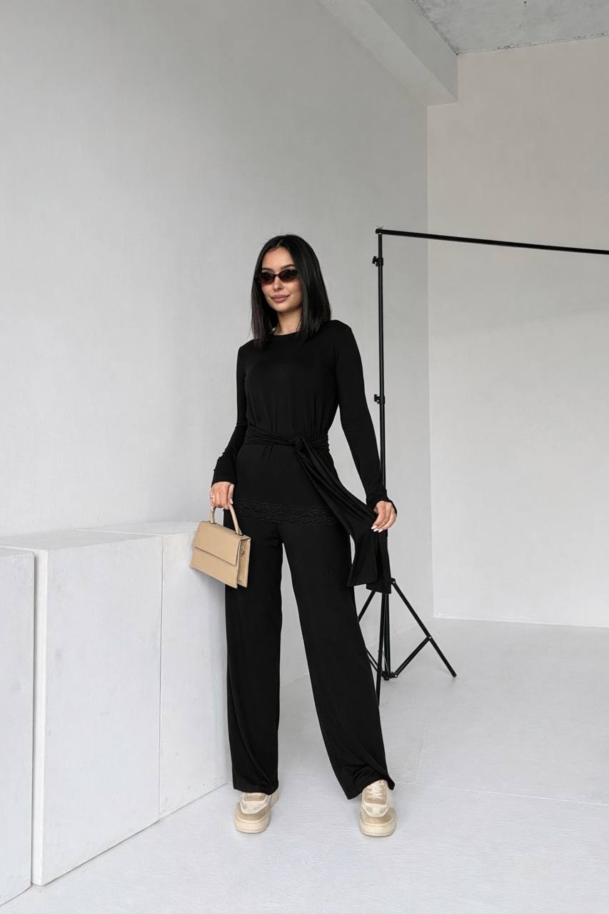 Трикотажный костюм (Лонгслив с кружевом+брюки палаццо) черный
