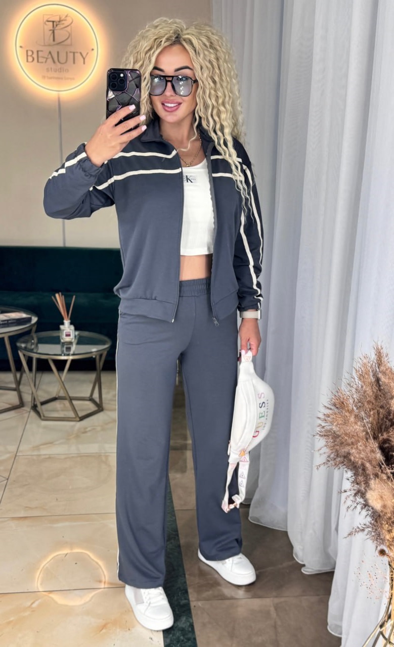 Трикотажный костюм с лентами контрастного цвета (кофта на молнии+брюки прямого кроя) графит