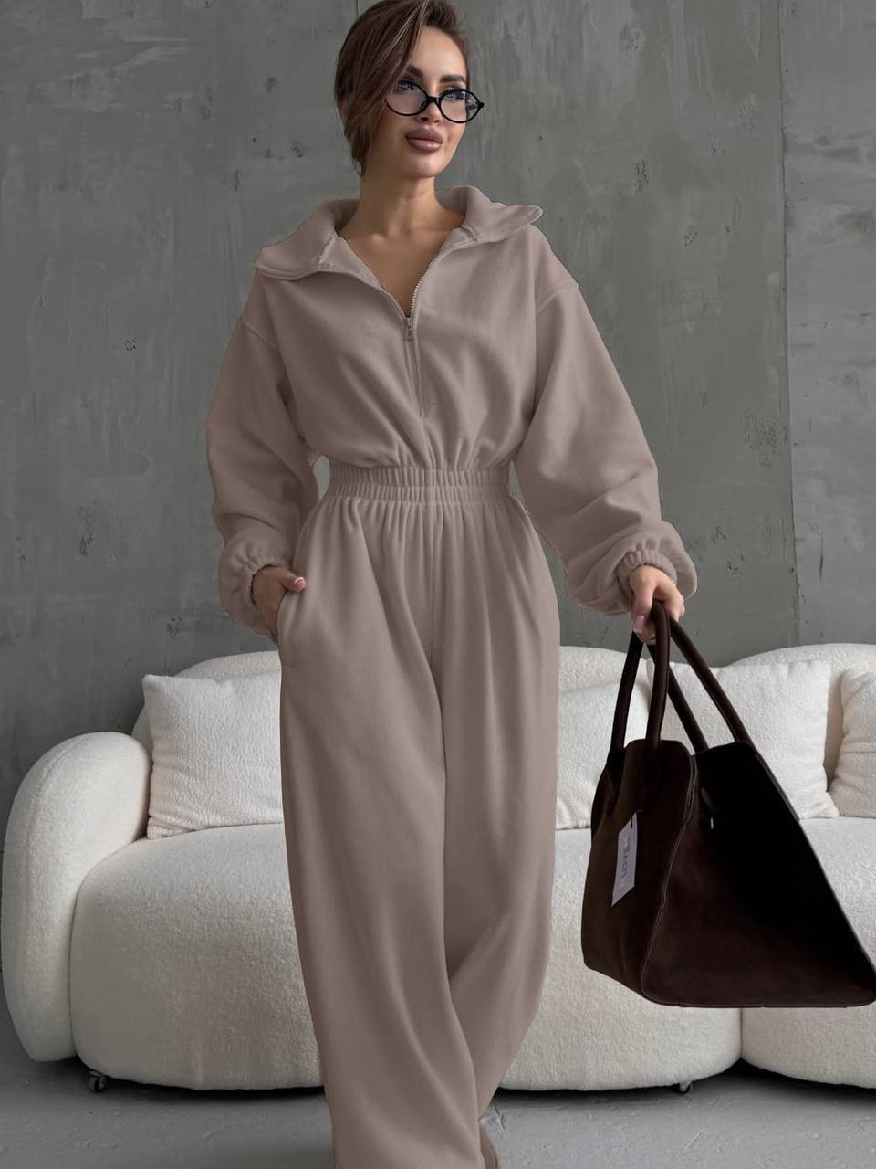 верх на замке, аккуратно выделенная талия и прямые брюки с кулиской по низу, невероятно теплый и удобный ❤️