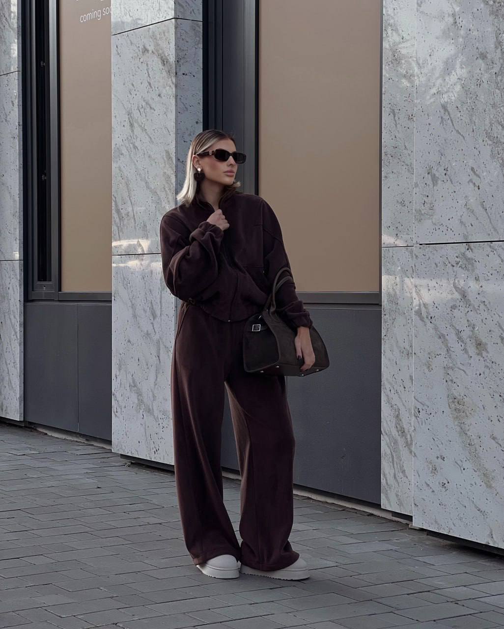 Теплый флисовый костюм, кофта-бомбер идет на молнии, брюки-палаццо снизу на кулиске (можно затягивать)