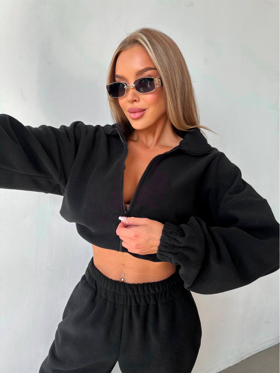 Флисовый костюм: Кофта и штаны на затяжках черный