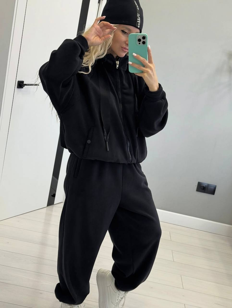 Головна » Магазин » ОДЕЖДА » ЖЕНСКИЕ СПОРТИВНЫЕ КОСТЮМЫ » Флисовый костюм: кофта с капюшоном+широкие штаны черный